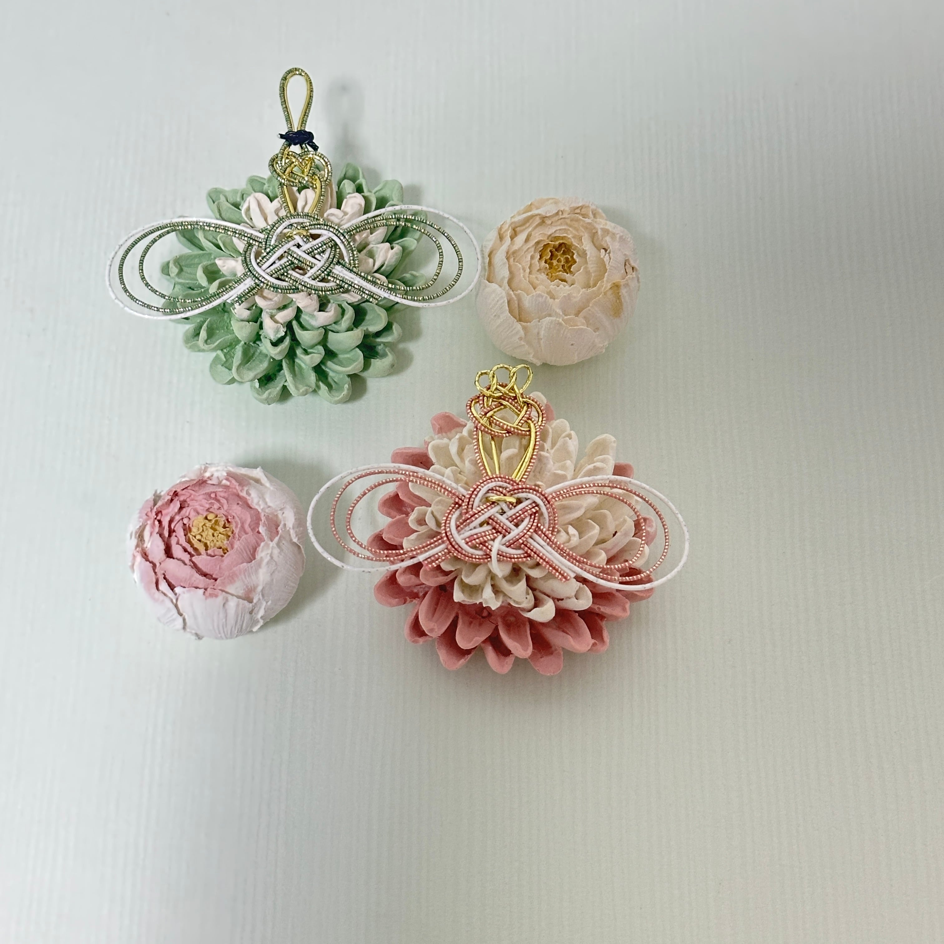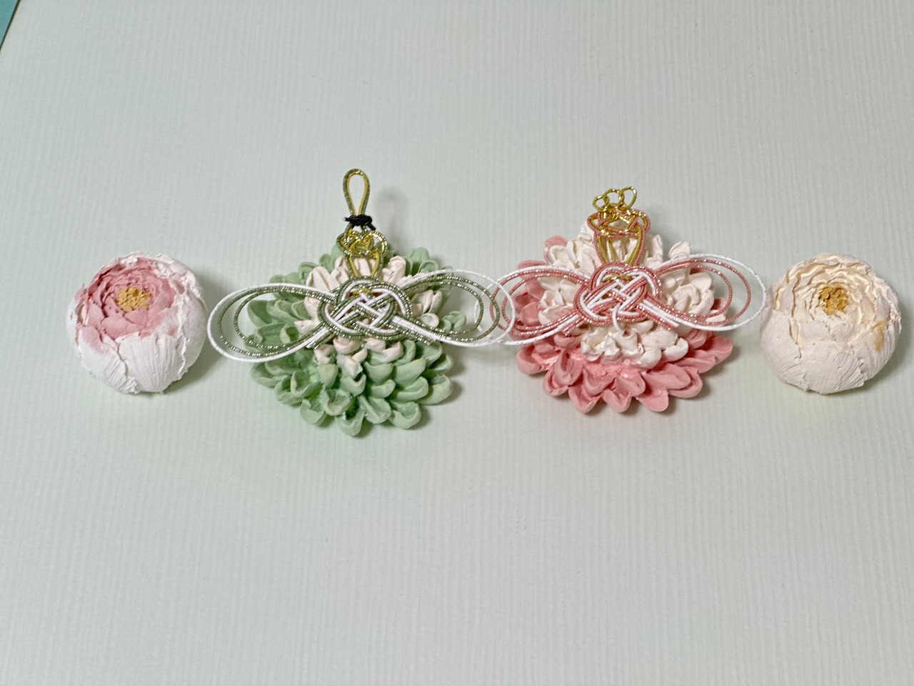 お雛様カラーのラコッタに飾り水引を組み合わせました。